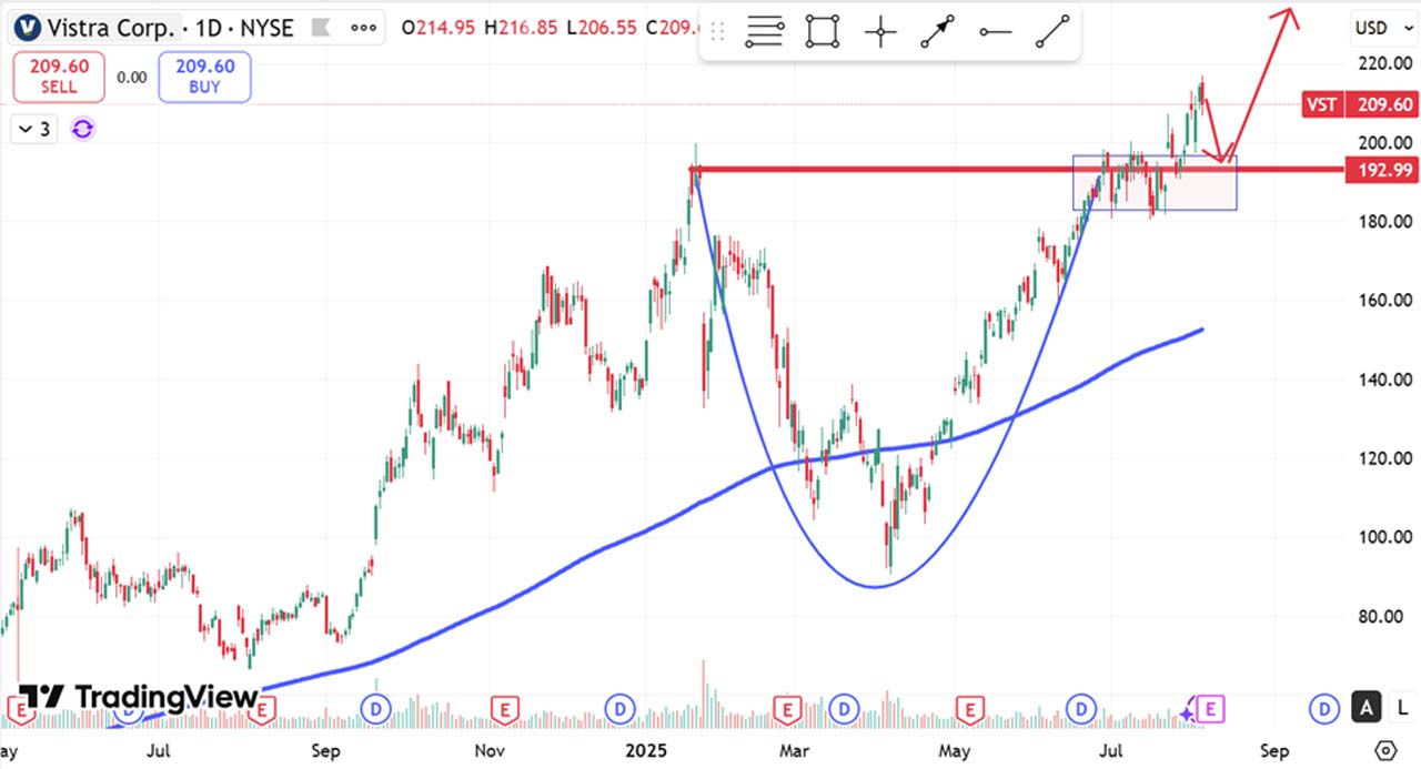 Übertrifft Vistra die Erwartungen und liefert einen starken Ausblick, wäre ein Pullback auf 200 USD eine interessante Einstiegszone.
