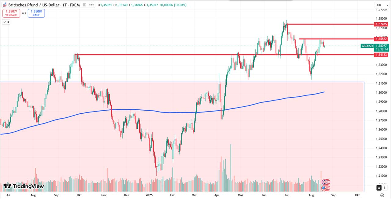 Das Währungspaar hat sich zuletzt erholt und ein höheres Hoch gebildet, traf aber bei 1,3580/1,36 auf deutlichen Widerstand. Solange dieses Level nicht nachhaltig überwunden wird, bleibt die Zone ein neuralgischer Punkt. Auf der Unterseite ist die Unterstützung bei 1,3380/1,3410 entscheidend, weil dort mehrere frühere Hoch- und Tiefpunkte liegen.
