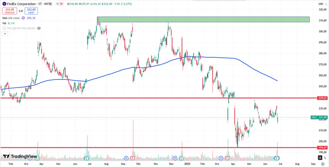 Die Aktie befindet sich in einem klaren Abwärtstrend und notiert unterhalb der fallenden 200-Tage-Linie, was für mich ein technisches Warnzeichen darstellt. Trotz kurzfristiger Stabilisierung ist FedEx in der aktuellen Konstellation eher ein Short-Kandidat. Erst bei einer nachhaltigen Etablierung über der 240er Marke verbessert sich das technische Bild.