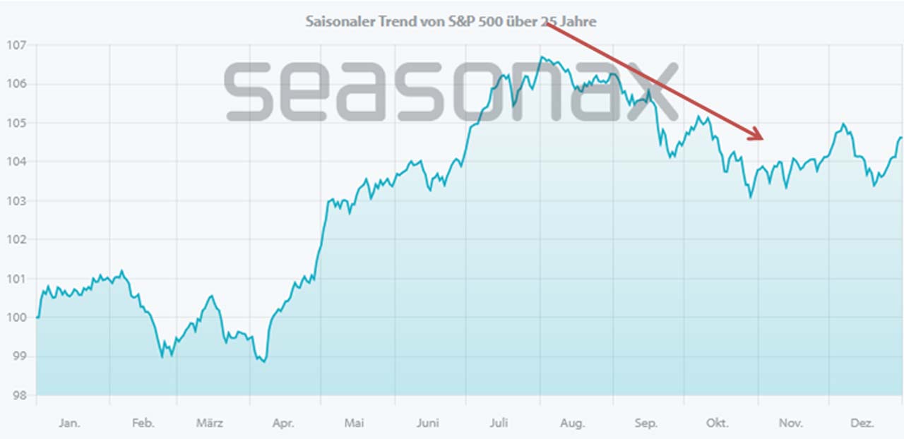 Sie können sehen, wie die Kurse am Monatswechsel vom Juli zum August ihr Hoch ausbilden und ab dann fallen (Pfeil). Dabei ist der September besonders schwach.
