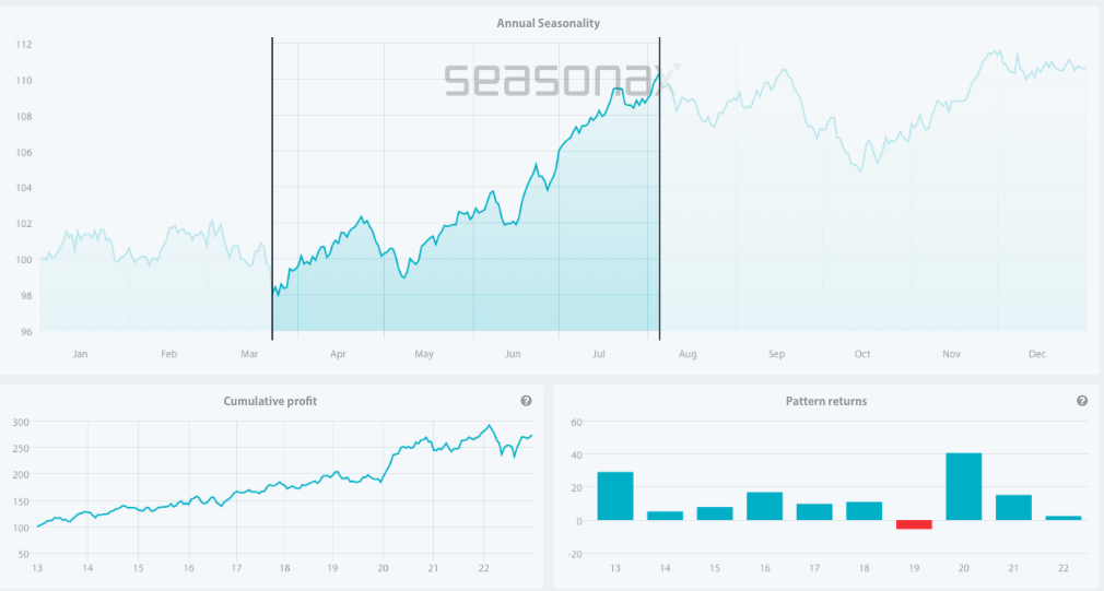 Betrachtet man den obigen saisonalen Chart, so war der Zeitraum vom 23. März bis zum 5. August in den letzten 10 Jahren recht günstig für diesen ETF. Die Performance stieg im Durchschnitt um fast 13 %. Darüber hinaus hatte das Renditemuster seit 2013 eine Gewinnquote von 90 %, was bedeutet, dass der iShares Biotechnology ETF in 9 der 10 Jahre des ausgewählten Zeitraums Gewinne erzielte.