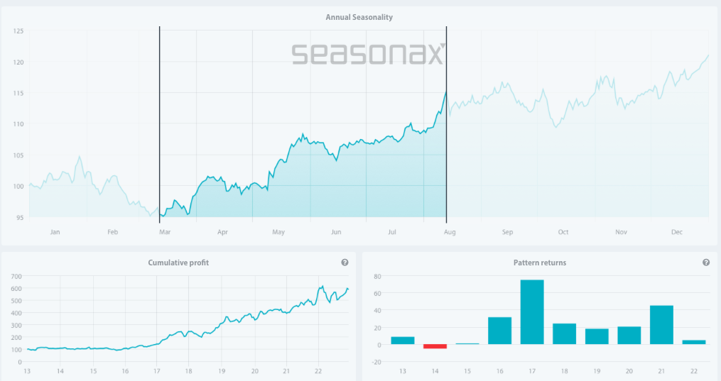 Im Hinblick auf den Markteintritt hatten Anleger, die ihr Geld in den letzten 10 Jahren ab März investiert haben, einen Wettbewerbsvorteil gegenüber anderen. Dieses Unternehmen brachte im Zeitraum vom 7. März bis zum 13. August im Durchschnitt eine Rendite von fast 20 %.