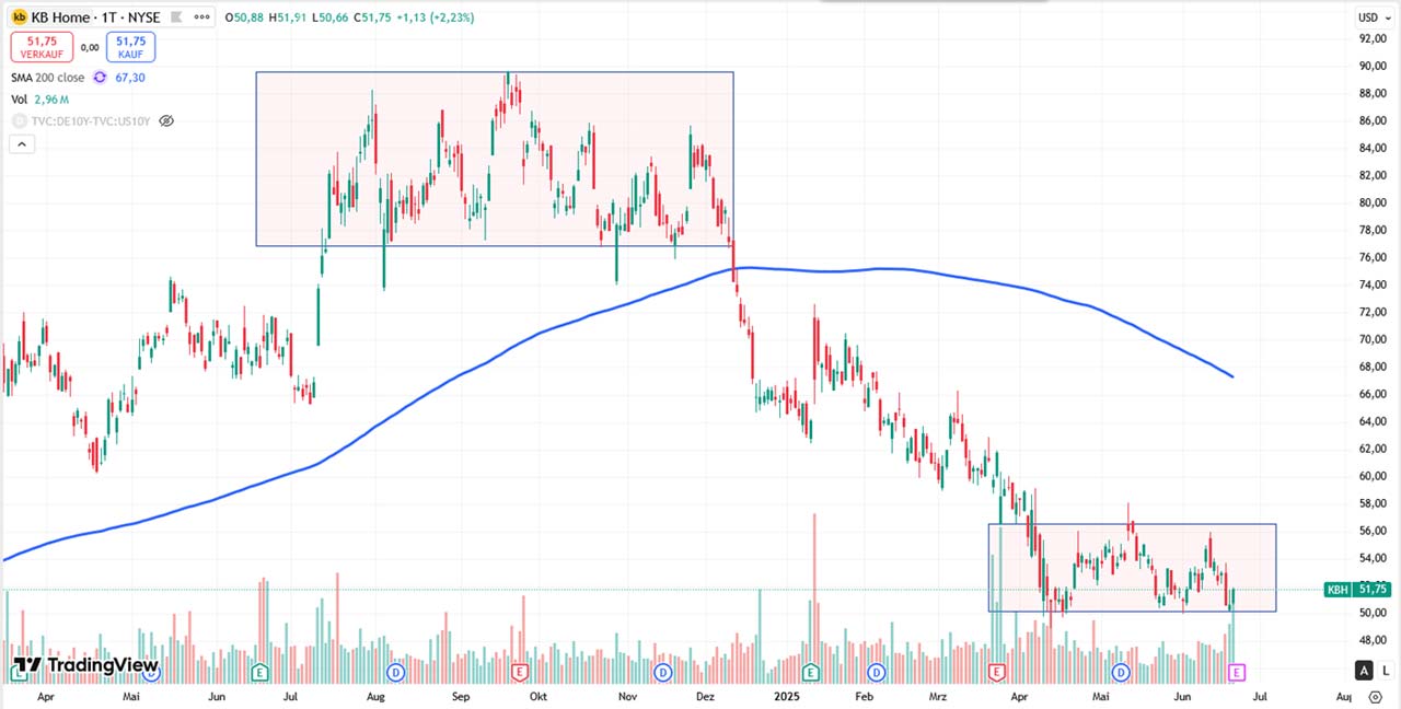KB Home bewegt sich in einem klaren Abwärtstrend und notiert unterhalb der fallenden 200-Tage-Linie. Zuletzt gab es eine Seitwärtskonsolidierung zwischen 50 und 57 und genau die Unterseite wird jetzt mit den Quartalszahlen getestet. Eine Richtungsentscheidung steht an.