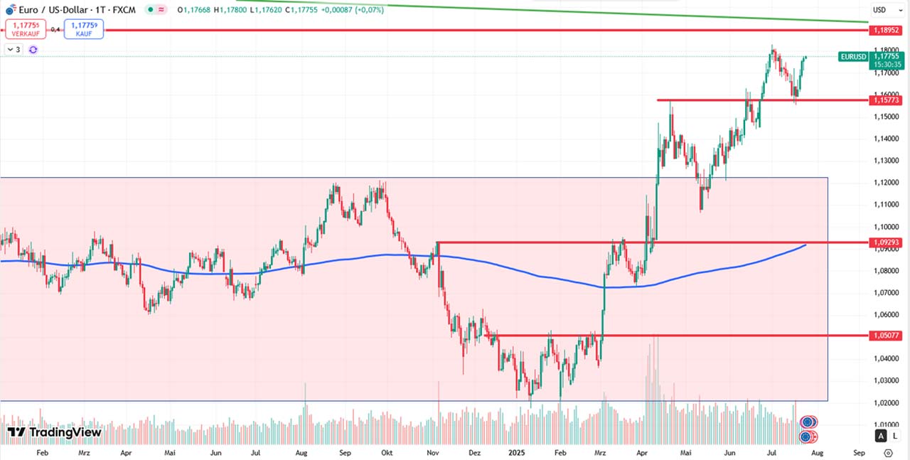Der Euro bleibt übergeordnet im Aufwärtstrend und bewegt sich aktuell in einer engen Range zwischen 1,1580 und 1,1820. Solange die Struktur nicht dreht, also höhere Hochs und Tiefs bestehen bleiben, bleibt der Trend intakt.