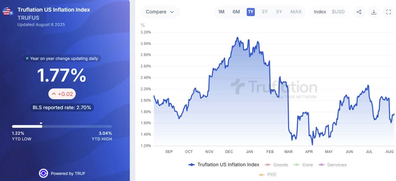 Die Truflation, ein Echtzeit-Indikator, signalisiert aktuell keinen nennenswerten Preisdruck, weil sie knapp unter de Inflationsziel der US-Notenbank Fed von 2% notiert.