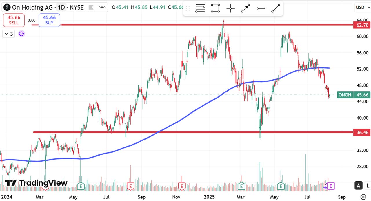 Seit über einem Jahr läuft die Aktie in einer breiten Range zwischen 36 USD und 64 USD. Derzeit notiert sie im Mittelfeld, was nicht ideal für spontane Setups ist, aber die Range bietet klare Ankerpunkte.