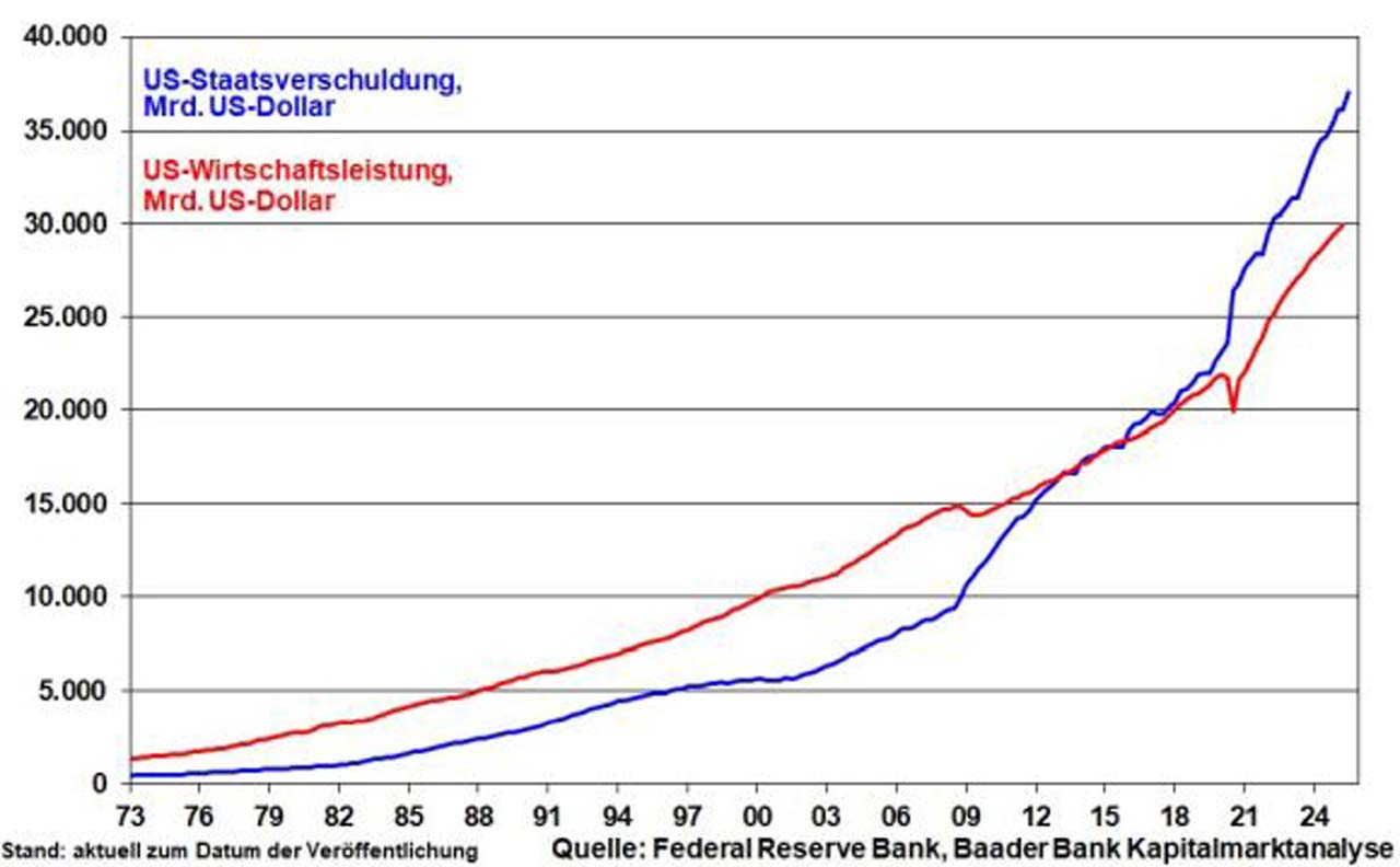 Momentan beträgt die Staatsverschuldung der USA über 37 Bill. Dollar. Allein über das große schöne „poetische“ Haushaltsgesetz – „The One, Big, Beautiful Bill“ – werden bis 2035 mindestens 3,5 Bill. dazukommen. Und bei den geplanten dramatischen Einsparungen gilt: Es kreiste der Berg und gebar eine Maus. Nein, Amerika hat mit der schwäbischen Hausfrau so wenig zu tun wie Vollmilchschokolade mit Diät.