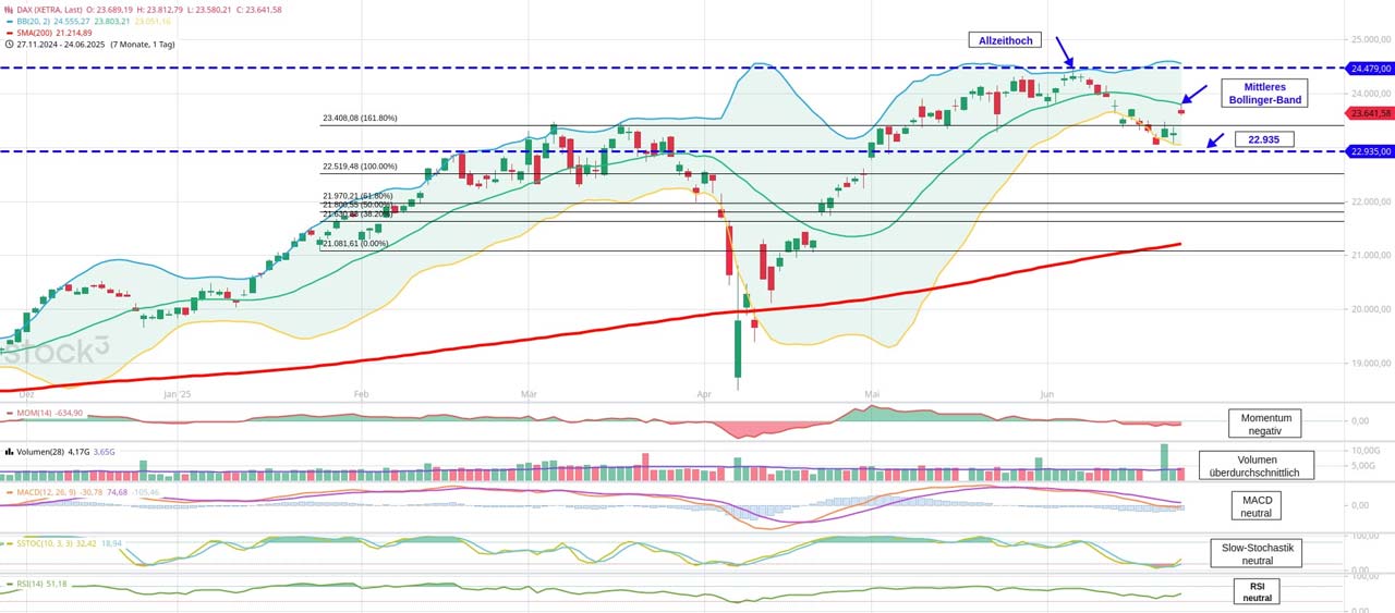 Deutscher Leitindex testet Mittleres Bollinger-Band- Nächste charttechnische Widerstände: 23.803 (Mittleres Bollinger-Band), 24.355, 24.479