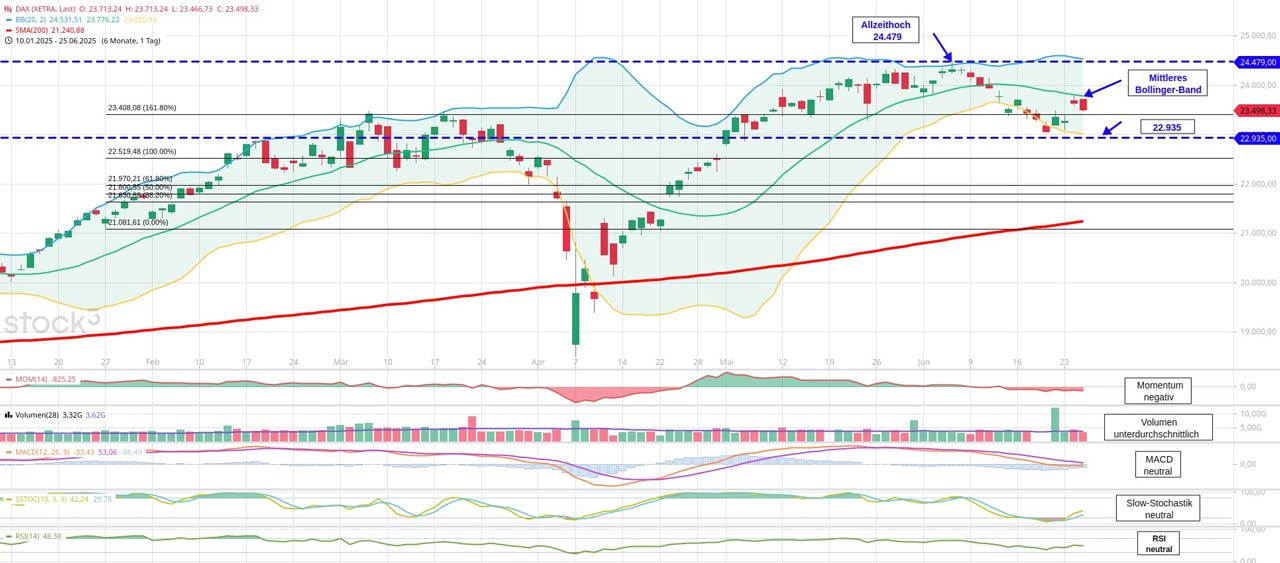 - Nächste wichtige charttechnische Unterstützungen: 23.408, 22.935, 22.826