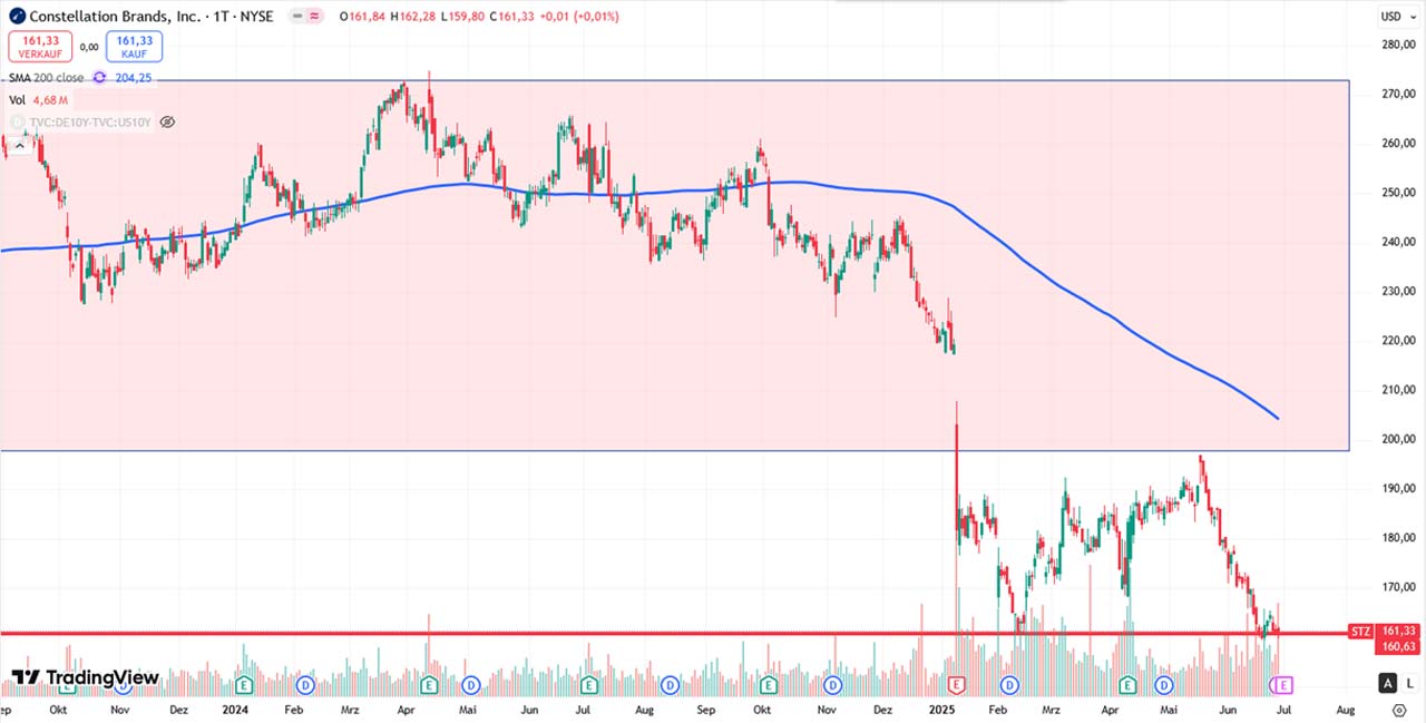 Die Aktie befindet sich klar im Abwärtstrend und notiert unterhalb der fallenden 200-Tage-Linie. Aktuell steht sie an einer wichtigen Unterstützung bei 161 USD, passenderweise zeitgleich mit den heutigen Zahlen.