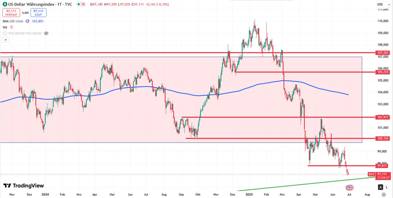 Kommt der ISM unter 46,8, könnte das die USD-Schwäche verstärken. Ich würde dann im Bereich des Widerstands bei etwa 98 nach einem Short-Setup suchen.