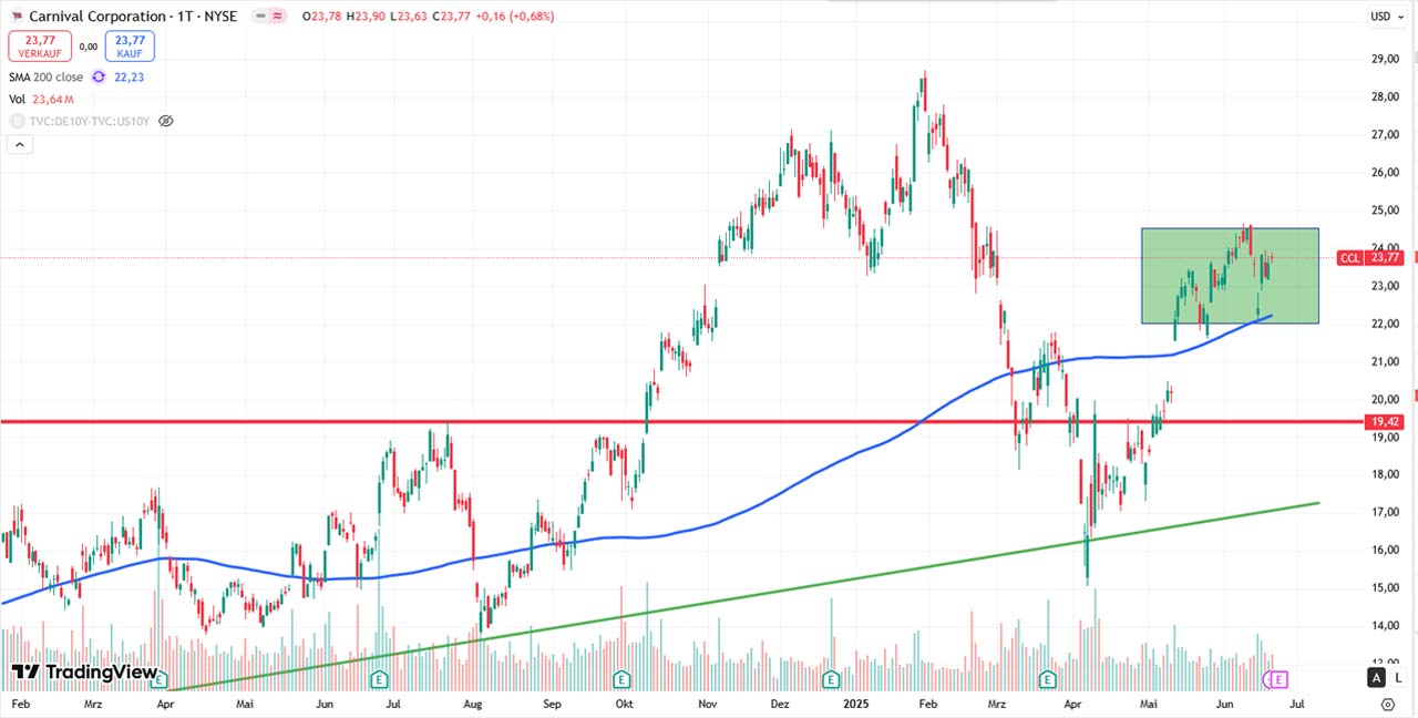 Übertrifft Carnival die Erwartungen und überzeugt mit einem positiven Ausblick, wäre ein Ausbruch über 24,50 ein mögliches Kaufsignal. Ich würde dann in einem Rücklauf auf diese Zone nach einem Einstieg suchen.