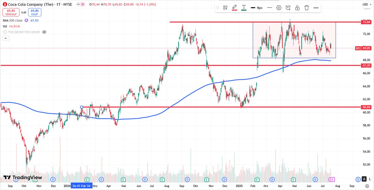Die Aktie von Coca-Cola bewegt sich seit dem Frühjahr oberhalb der 200-Tage-Linie in einer ausgeprägten Seitwärtsrange zwischen rund 68,50 und 74 US-Dollar. Diese Konsolidierungsphase zeigt, dass der Markt derzeit auf Impulse wartet, möglicherweise in Form der heutigen Quartalszahlen.