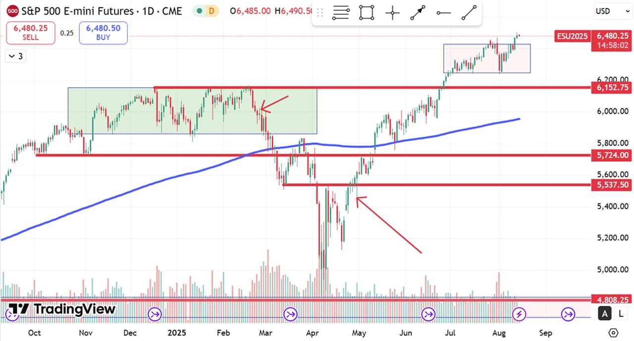 Der Aufwärtstrend ist klar intakt. Der S&P 500 Future notiert am Allzeithoch und versucht nun den Ausbruch aus einer engen Range zwischen 6250 und 6450 Punkten. Solange die Folge höherer Hochs und Tiefs anhält, bleibt das technische Bild positiv.