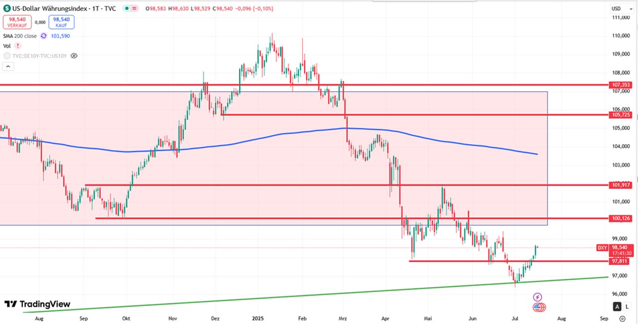 Der übergeordnete Abwärtstrend im US-Dollar bleibt intakt, doch die Gegenbewegung hält weiter an. Aktuell hat der DXY den Widerstandsbereich bei 97,80 bis 98 gebrochen. Für eine echte Trendwende müssten sich klar steigende Hochs und Tiefs ausbilden.