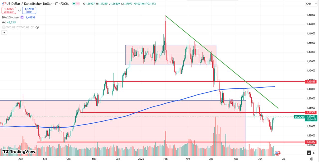 Der USDCAD bleibt in einem intakten Abwärtstrend und notiert inzwischen klar unter der 200-Tage-Linie. Wichtiger Widerstand: 1,3750–1,38. Dort verläuft auch die übergeordnete Abwärtstrendlinie. Auf der Unterseite liegen erste Unterstützungen bei 1,3550 und tiefer im Bereich 1,3430.