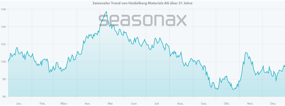 Ob Heidelberg Materials tatsächlich in der Ukraine oder in Gaza geschäftsbeeinflussend tätig werden wird, kann kaum vorhergesagt werden. Allerdings wird die Aktie immer wieder ins Gespräch gebracht, wenn es um den Wiederaufbau in den zerstörten Gebieten geht. Genau wie bei Rheinmetall fallen bei Heidelberg Materials zwei Zeiträume besonders auf. Von Mitte Mai bis Anfang Oktober stellt sich die Lage nicht besonders positiv dar (auch wenn dies in diesem Jahr nicht zu beobachten ist). In 19 Jahren in diesem Zeitraum werden durchschnittlich 17 % Verlust erwirtschaftet. Nur 11 Jahre performen in dieser Zeit positiv und generieren rund 16 % Gewinn.