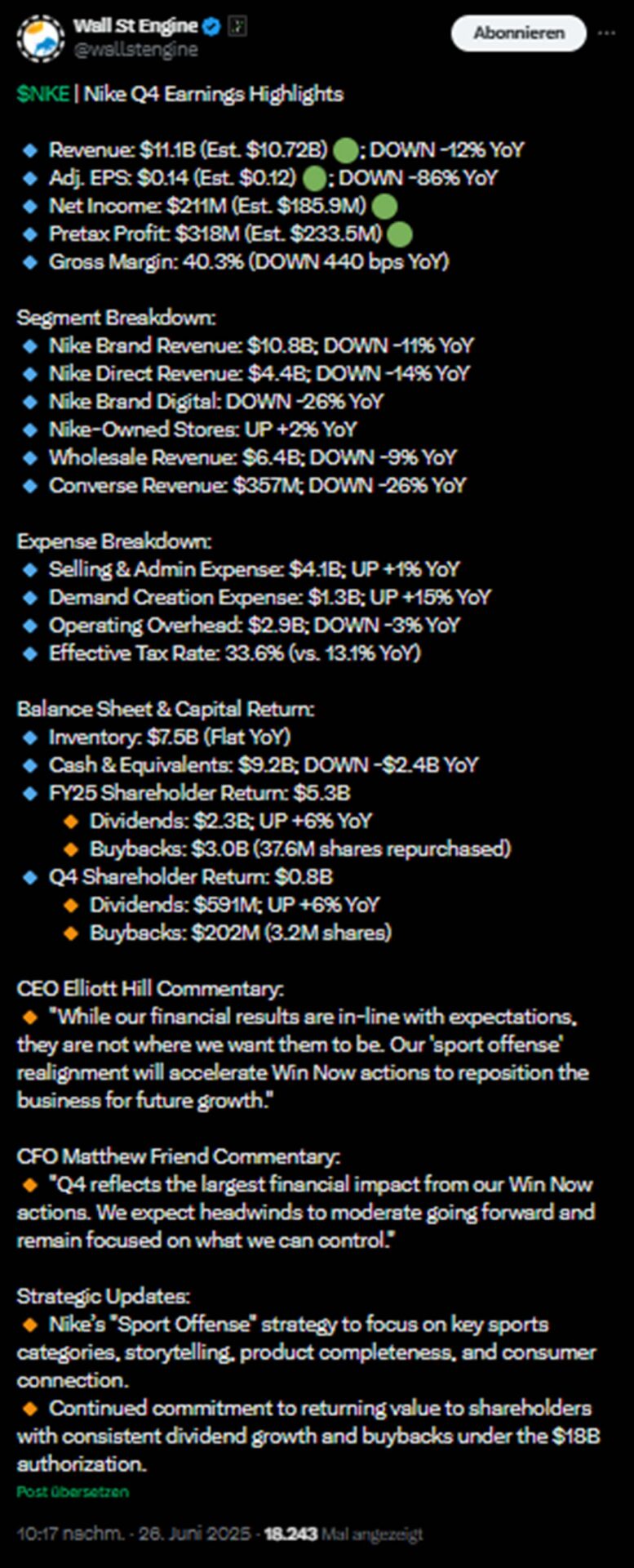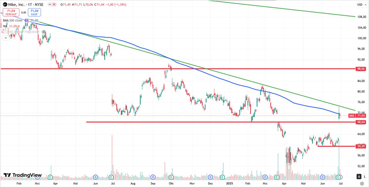 Die Zahlen waren zwar rückläufig, sowohl beim Umsatz als auch beim Gewinn, aber eben besser als vom Markt erwartet. Nach längerer Durststrecke reicht das oft schon für einen positiven Impuls. Entscheidend wird nun, ob Nike mit neuen Produkten nachlegen kann, wie etwa mit dem neuen Sneaker „Air Max Phenomena“.