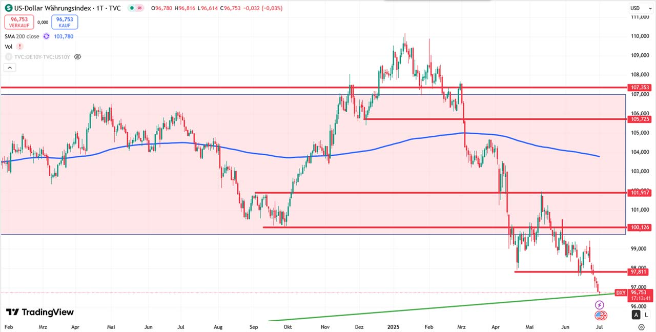 Der USD befindet sich im Abwärtstrend, aber von unten nähert sich eine langfristige Aufwärtstrendlinie als nächste Unterstützung bei ca. 96,70. Dort kann es aus meiner Sicht sehr interessant werden.