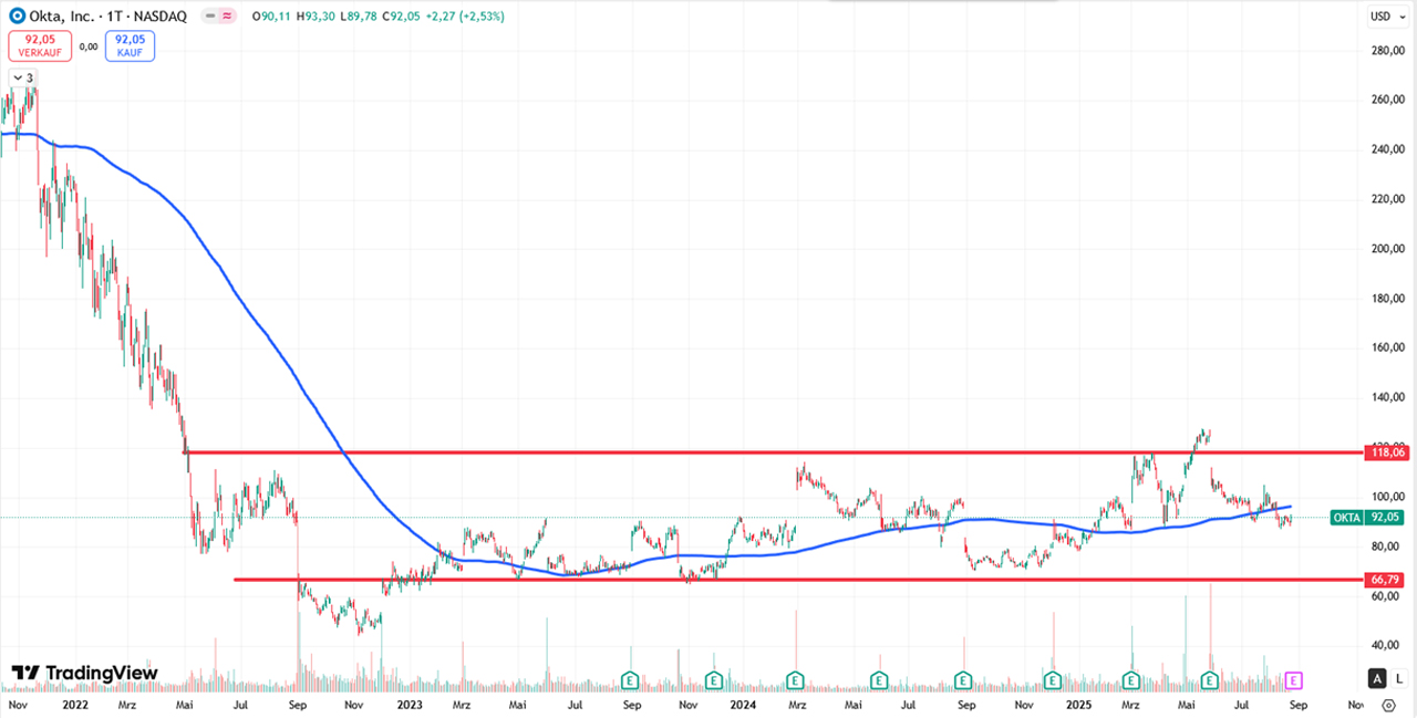 Die Aktie bewegt sich seit Monaten in einer breiten Range zwischen 67 und 120 USD. Ein wenig wie ein Schiff, das auf offener See treibt, ohne klaren Kurs. Aktuell notiert Okta knapp unter der 200-Tage-Linie und zeigt damit relative Schwäche gegenüber anderen Techwerten. Somit bin ich vorsichtig, weil mir relative Schwäche als Warnsignal dient.