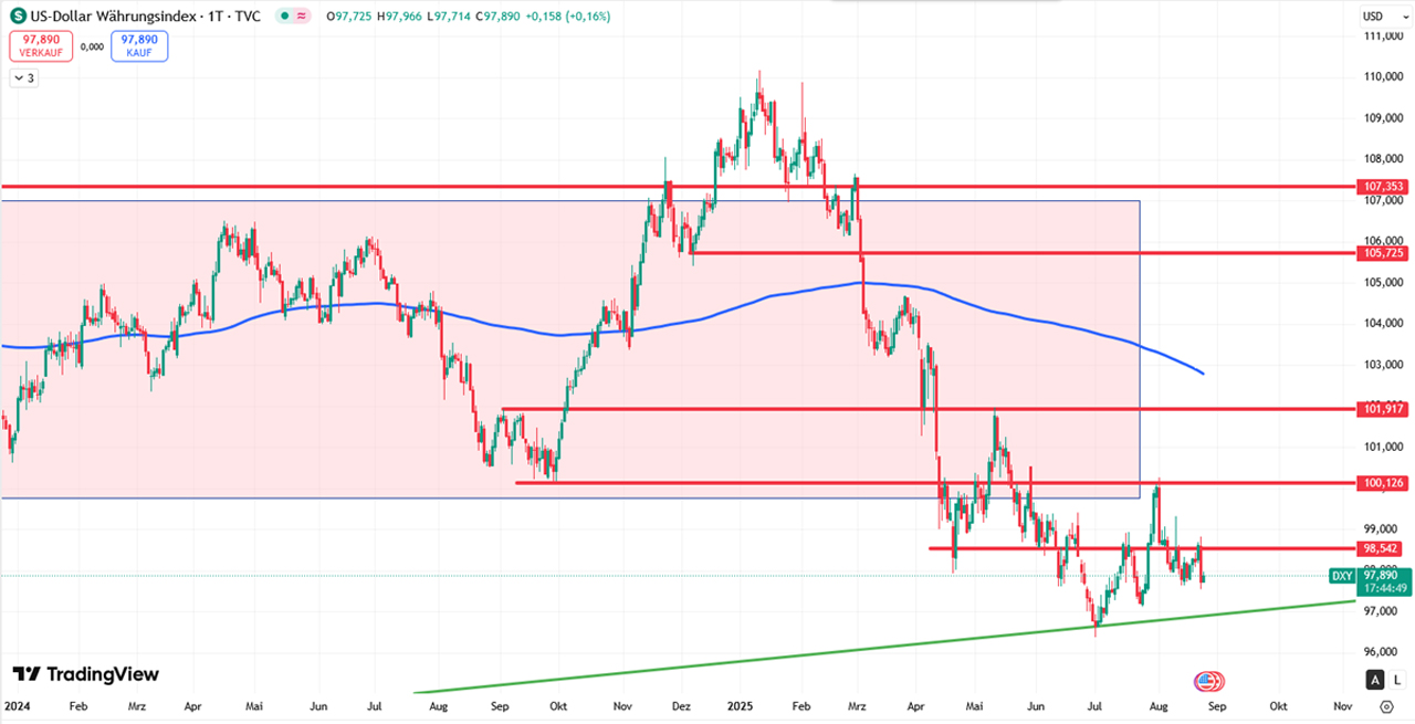 Der Dollar-Index zeigt schwächere Strukturen mit tieferen Hochs und Tiefs. Im Bereich um 97 liegt eine Schlüsselunterstützung, die über den weiteren Weg entscheiden dürfte. Ein Bruch nach unten könnte die Dollar-Schwäche beschleunigen, während eine Stabilisierung Raum für eine Erholung eröffnet.